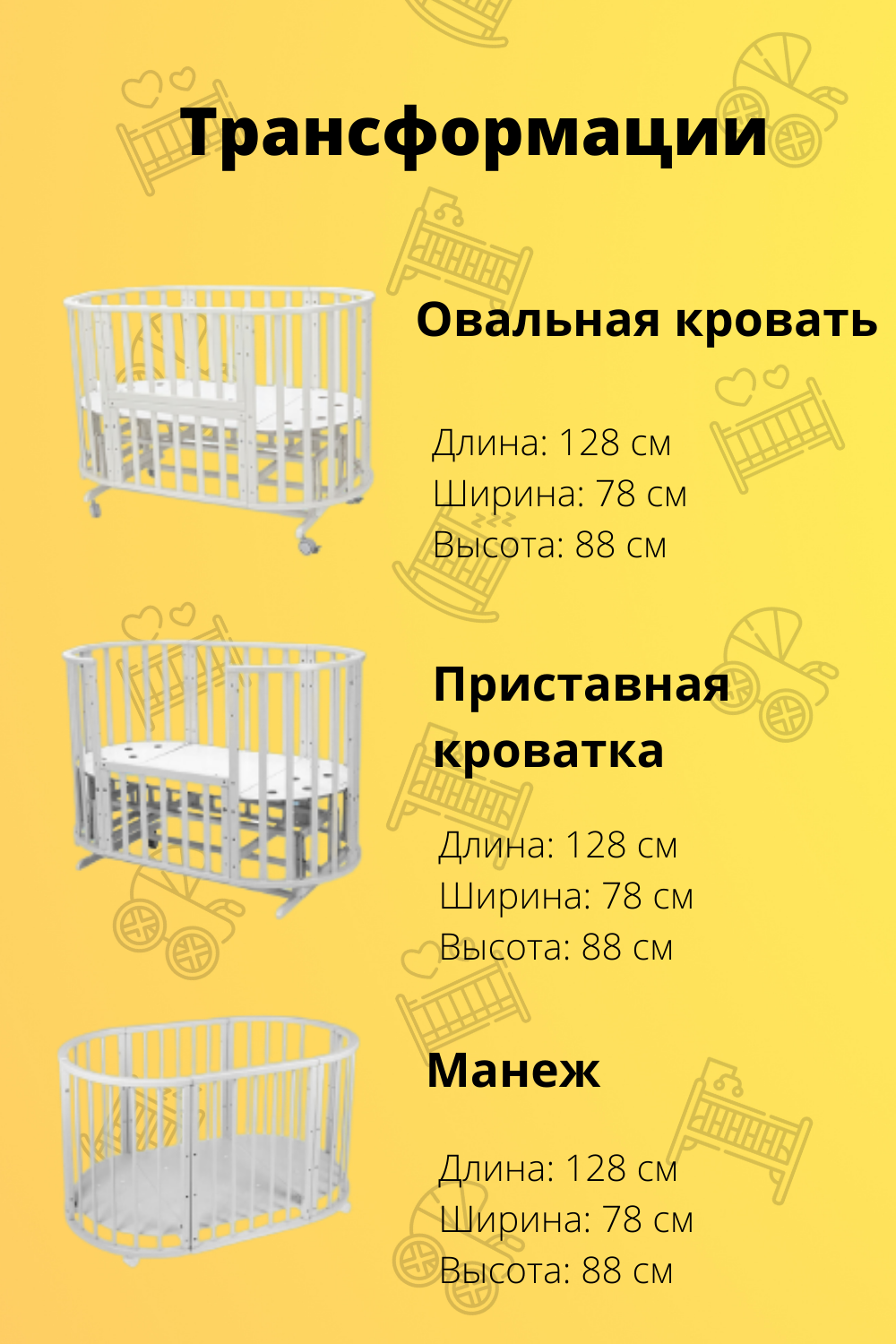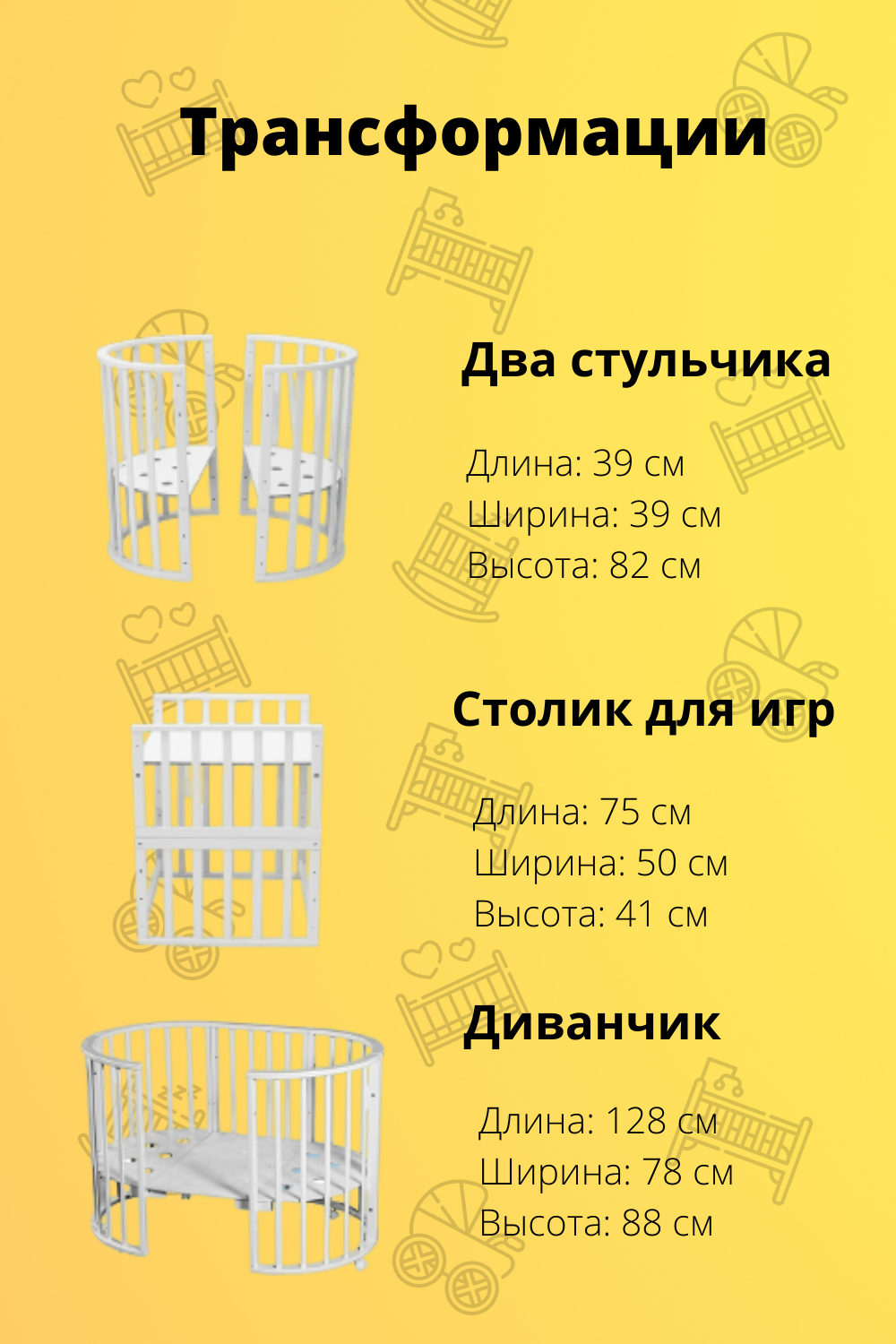 | Особенности | пеленальный столик 75х50 см; трансформируется в овальную кроватку размером 125*75 см / приставную кроватку-диванчик / 2 стульчика и маленький игровой столик; состав: 90% берёза / 10% МДФ |
