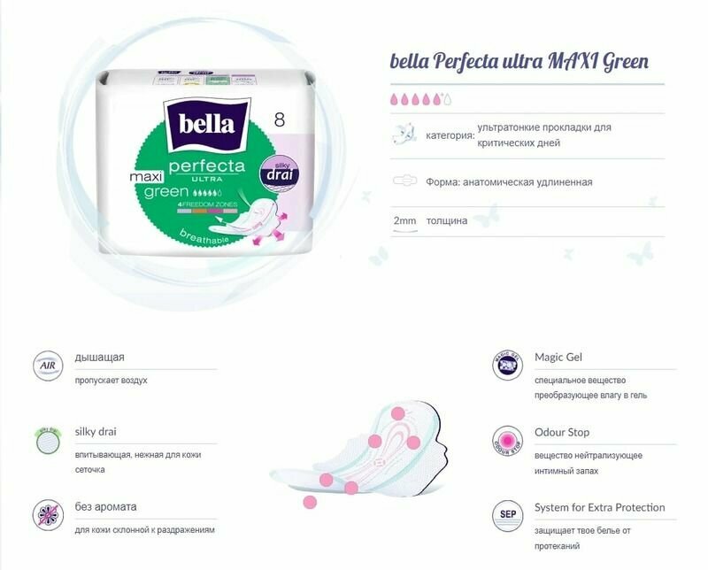 СохранитьПрокладки женские bella Perfecta Ultra Maxi Green, 8 шт. интересное: