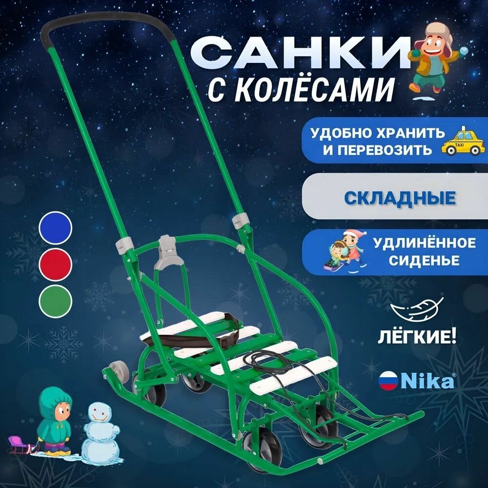Детские зимние складные санки Ника "Nikki 3" с выдвижными колёсами, складной спинкой, родительской ручкой, задними съемными колёсиками и страховочным ремнём, цвет зеленый