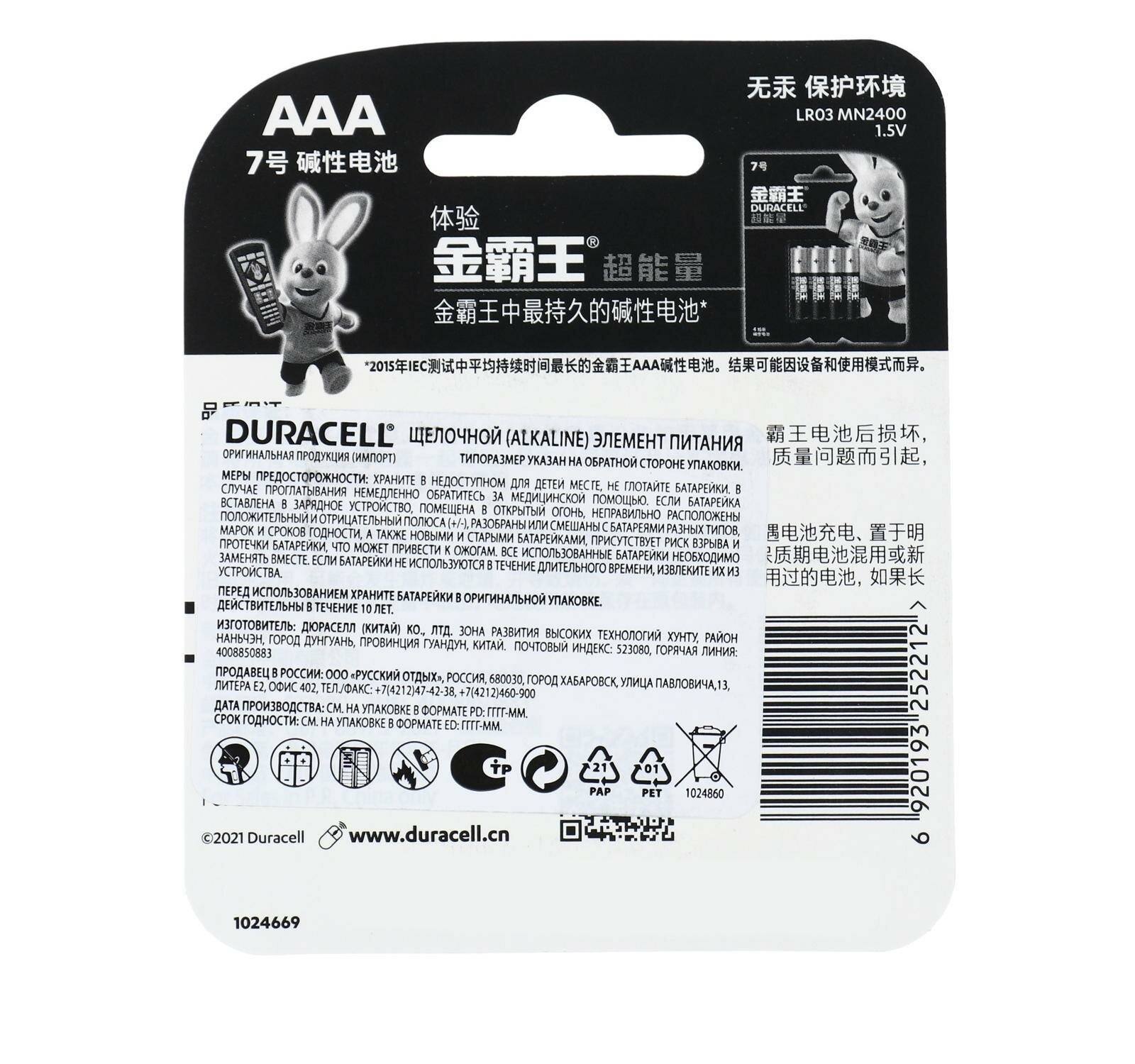 Duracell AAA (LR03/MN2400) | Китайские 1.5 Вольта, Щелочные (Алкалиновые) батарейки - 24шт.