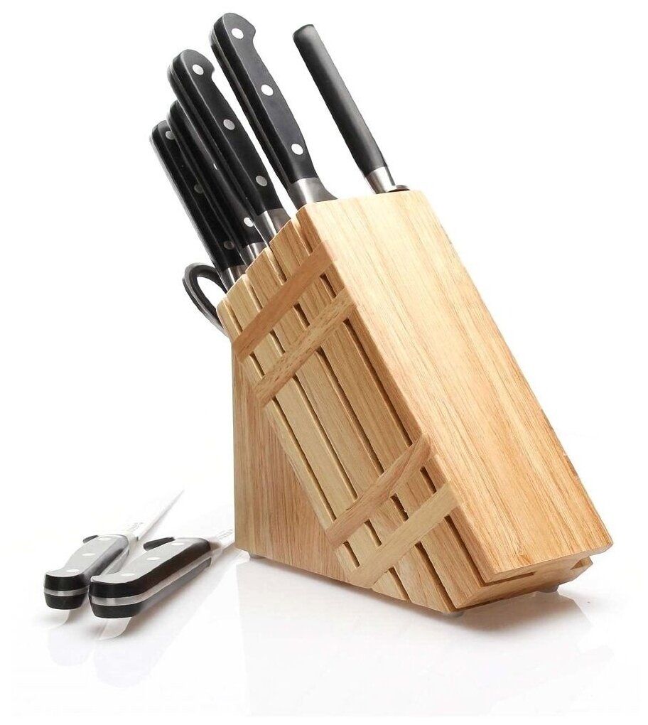 | Комплектация | Нож поварской: длина клинка 20.3 см, толщина 3 мм; Нож для мяса: длина клинка 20.3 см, толщина 3 мм; Нож для хлеба: длина клинка 20.3 см, толщина 3 мм; Нож разделочный: длина клинка 13.9 см, толщина 2.5 мм; Нож универсальный: длина клинка 12.7 см, толщина 2.5 мм; Нож для овощей: длина клинка 7.6 см, толщина 2 мм; Мусат: длина 20.3 см, толщина 10.0 мм; Ножницы кухонные: толщина лезвий 3 мм, подставка из дерева |