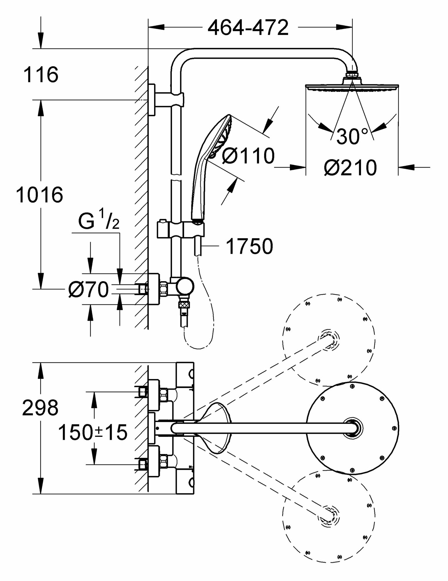 | Дополнительная информация | система twist-free, внутренний охлаждающий канал; режимы потока воды от производителя: rain, smartrain, massage jet; высота стойки для душа: 1132 мм; диаметр душевой лейки: 110 мм; диаметр верхнего душа: 210 мм |