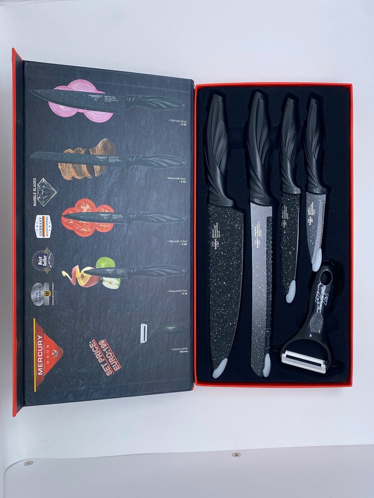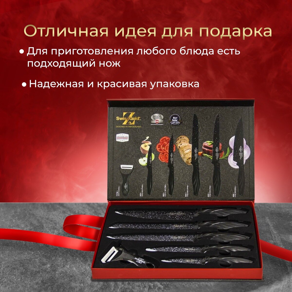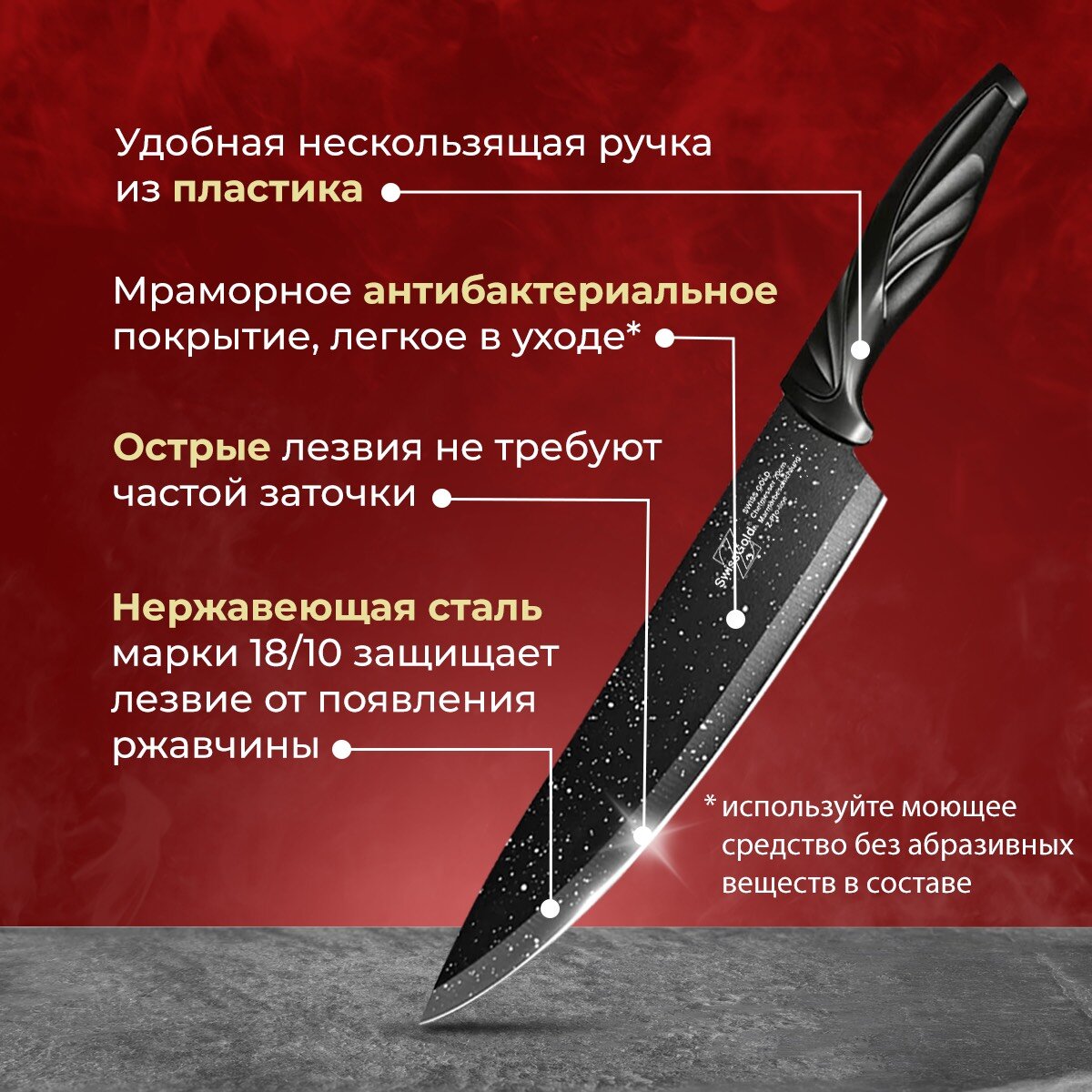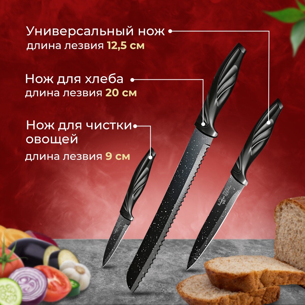 | Типы ножей в наборе | нож для овощей, нож для хлеба, разделочный нож, универсальный нож, шеф-нож |