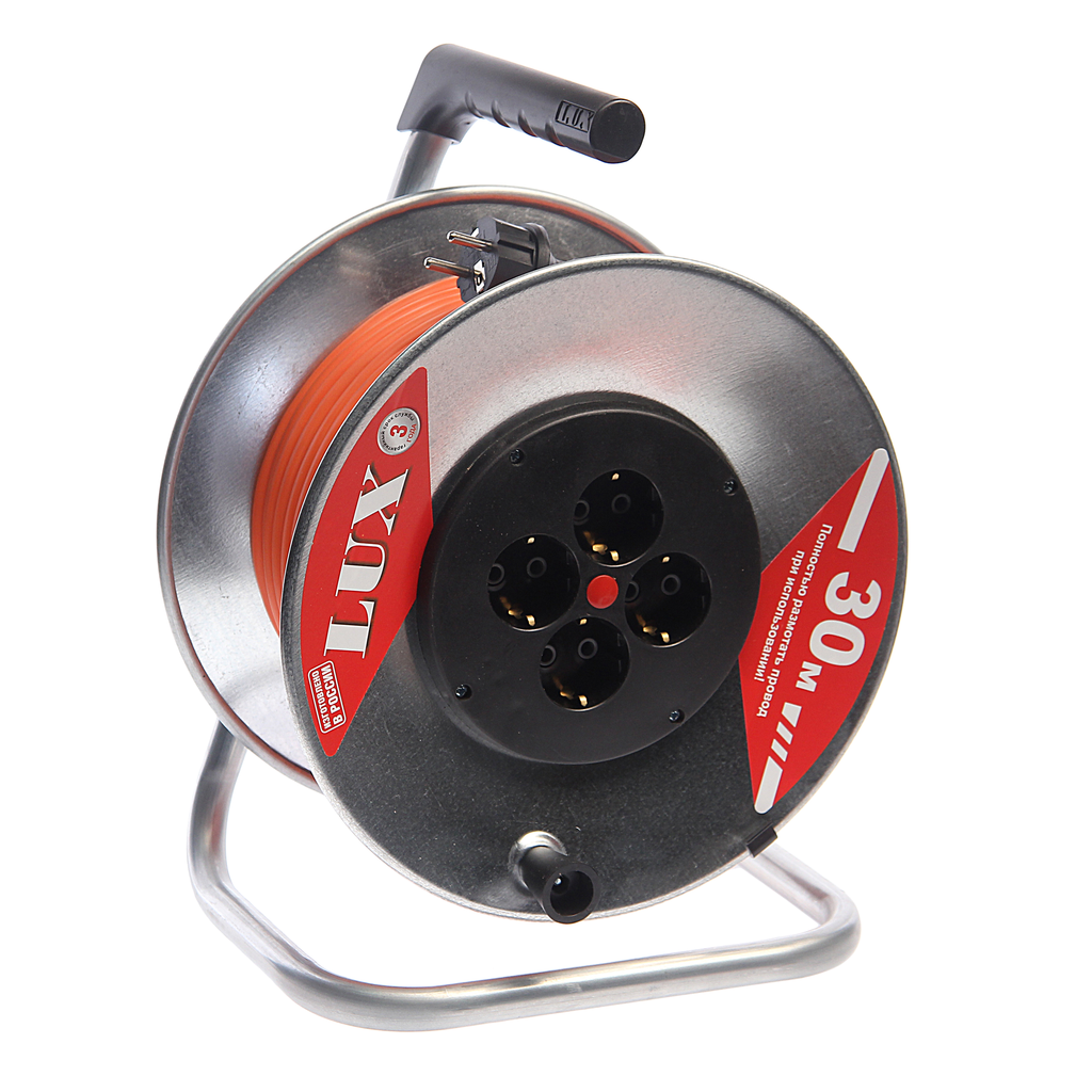 Силовой удлинитель на металлической катушке LUX К4-Е-30 30м 4 розетки с з/к 4606400419426
