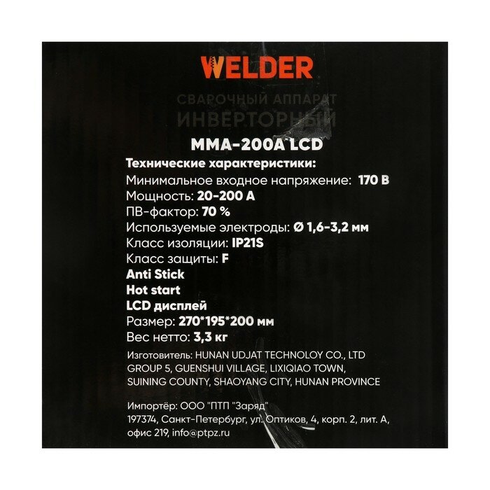 Welder Сварочный аппарат Welder MMA-200A LCD, 4.4 кВт, 20-200 А, 1.6-3.2 мм, LCD дисплей, 2 кабеля интересное: