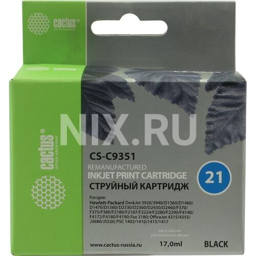 Картридж струйный Cactus CS-C9351 №21 черный (17мл) для HP DJ 3920/3940/D1360/D1460/D1470/D1560/D2330/D2360/D2430/D2460/F370/F375/F380/F2180/F2187/F22