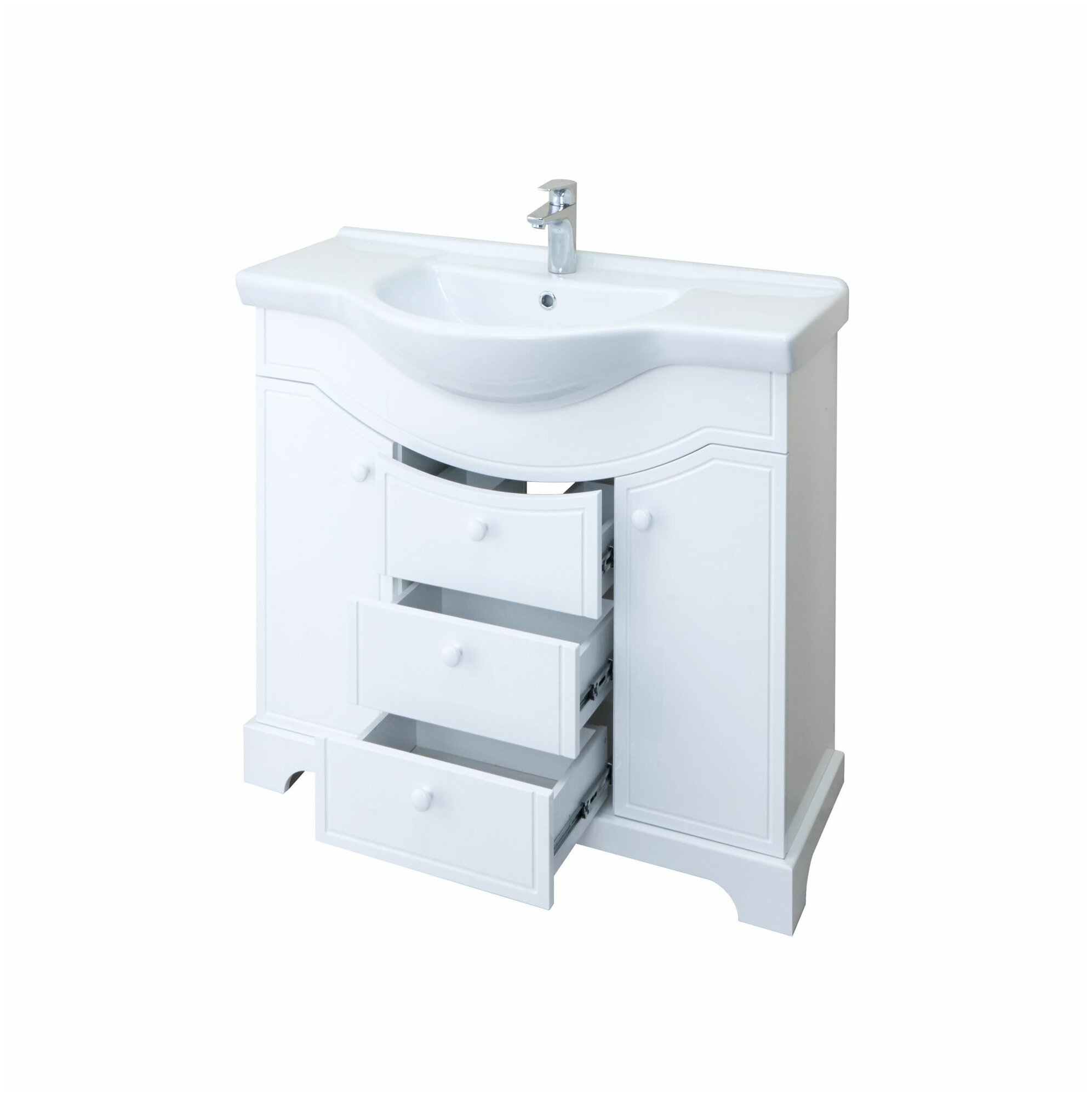 | Комплектация | 3 ящика, 2 дверцы, 2 полки, регулируемые по высоте; раковина не входит в комплектацию |