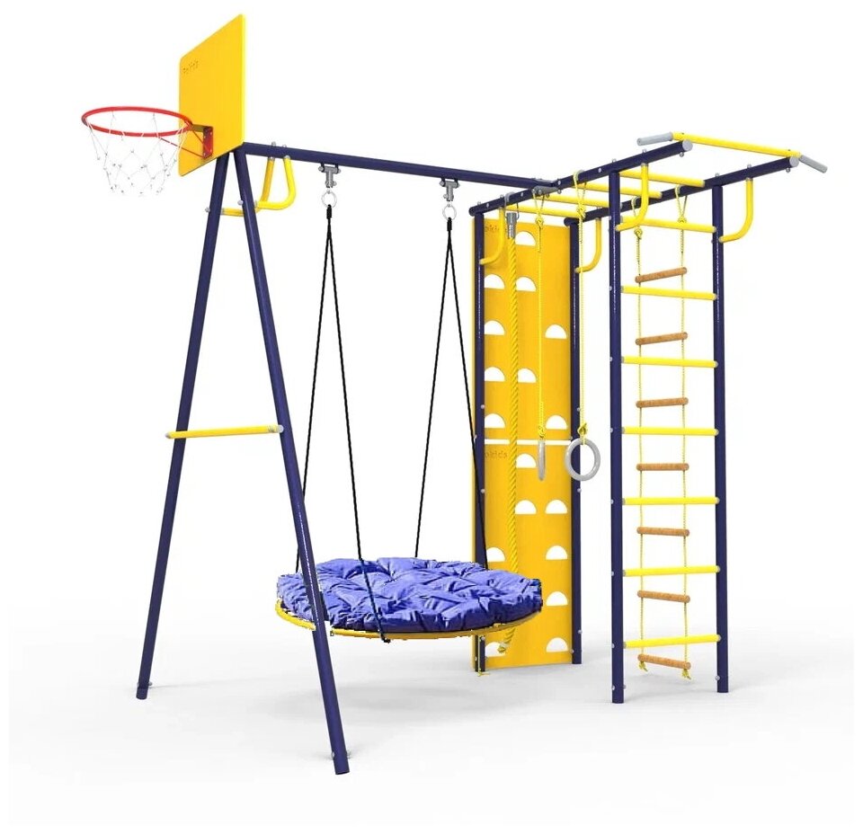 | В комплекте | баскетбольное кольцо, веревочная лестница, гимнастические кольца, канат, качели, рукоход, скалолазная стенка, турник |