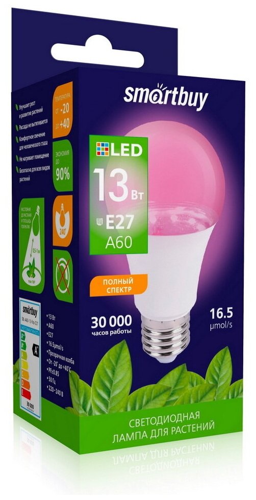 Ниже Вы можете прочитать отзывы на Светодиодная лампа фито Smartbuy-A60-13W/E27, ознакомится с подробными характеристиками, посмотреть интересные обзоры и фотографии на Светодиодная лампа фито Smartbuy-A60-13W/E27.