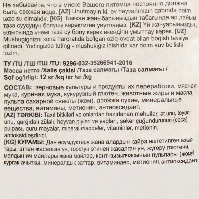 | Состав | Зерновые культуры и продукты их переработки, мясная мука, куриная мука, кровяная мука, животные жиры и масла, свекольный жом, дрожжи пивные, витамины, микроэлементы, аминокислоты, антиоксидант |