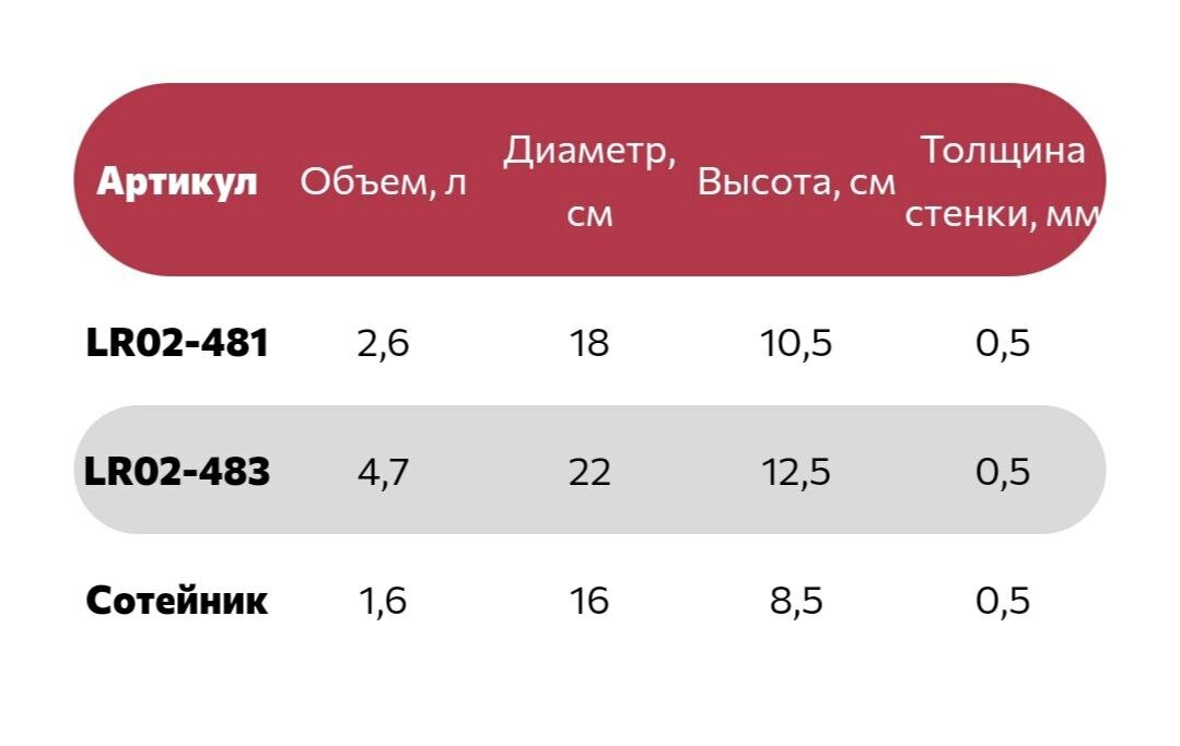 | Комплектация | кастрюли: 2.6 л, 4.7 л; ковш: 1.6 л; 3 крышки |
