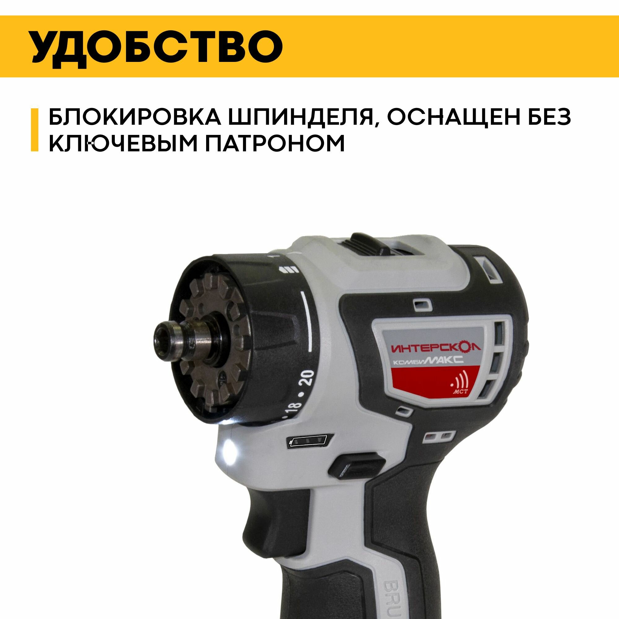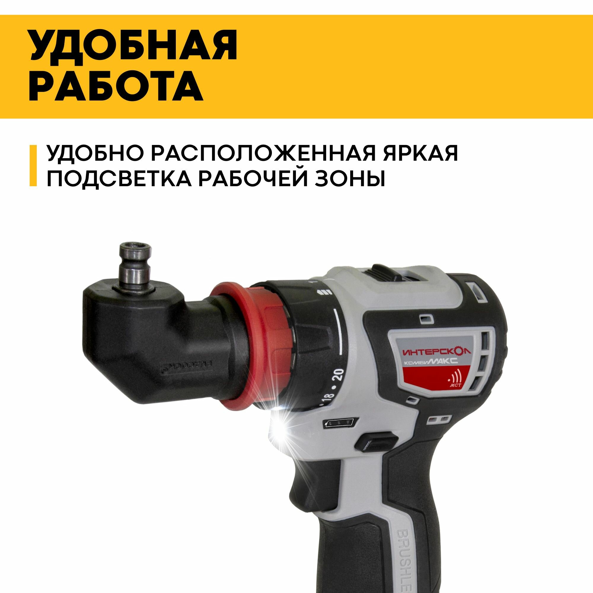 Профессиональная дрель-шуруповерт с бесщеточным двигателем Интерскол ДА 13/18В 50 Комби 776.2.2.79
