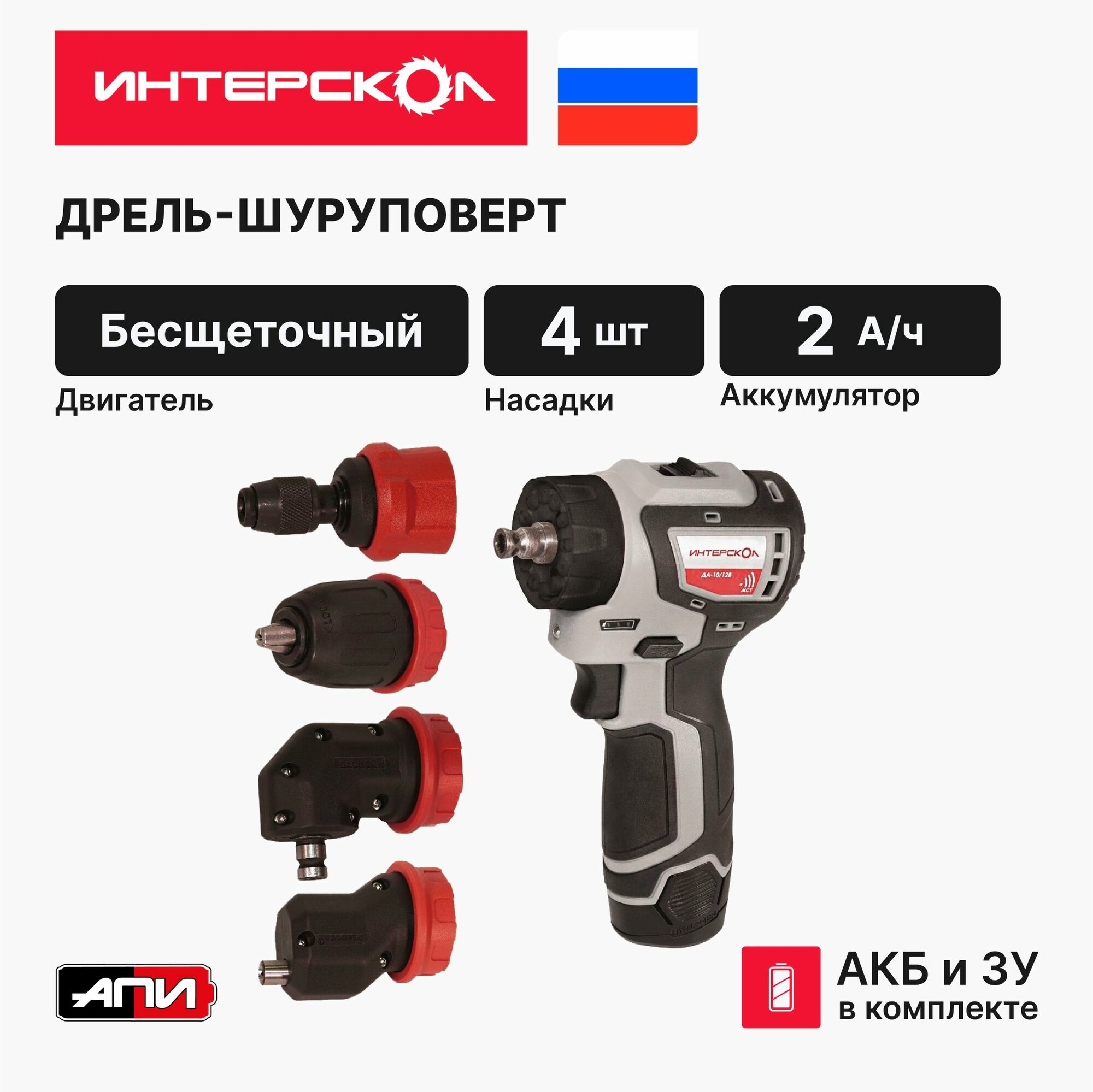 Дрель-шуруповерт аккумуляторная ИНТЕРСКОЛ ДА-10/12В 36 комбимакс бесщеточная 2 2ач, 4 насадки