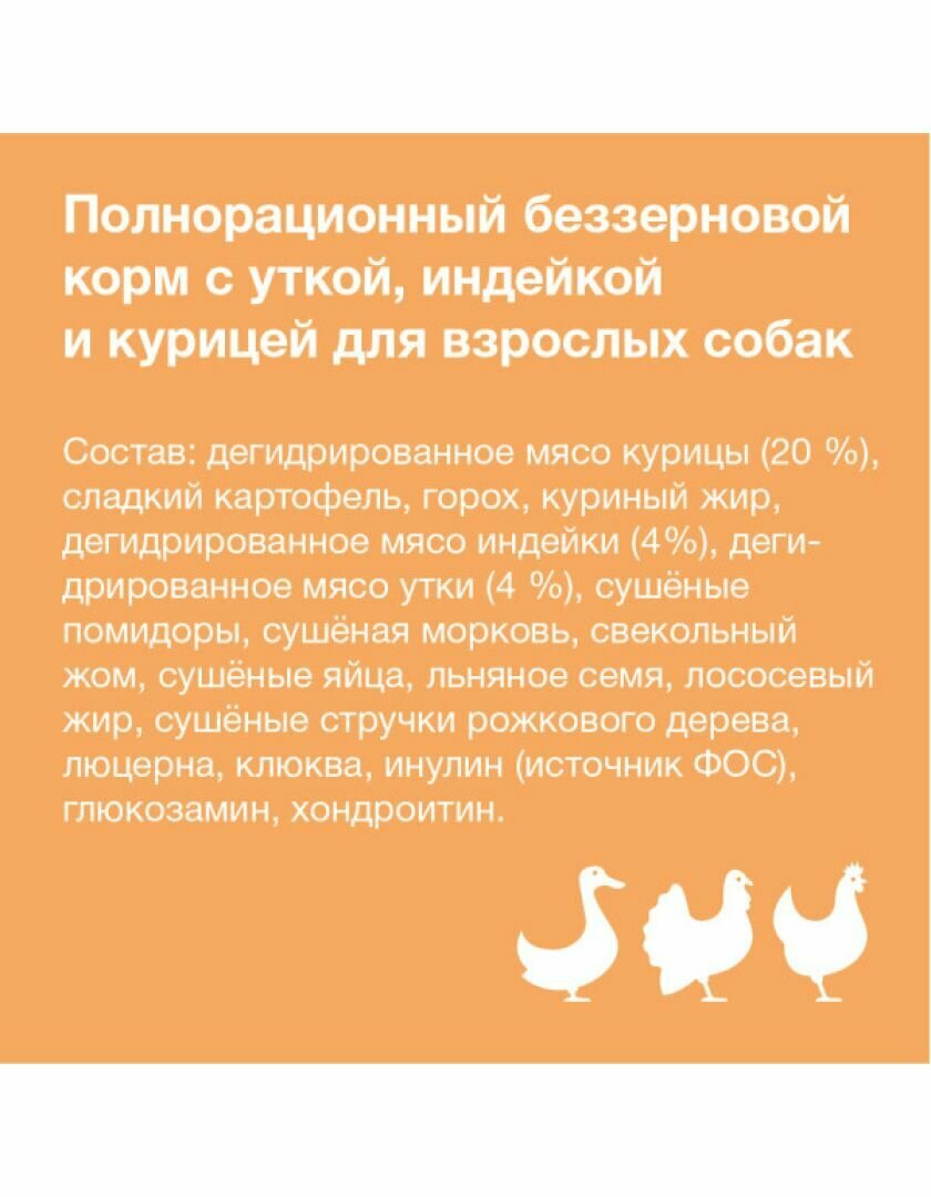 | Состав | длинный рис (14%), дегидрированное мясо утки (8% ), маис, ячмень, куриный жир, свекольный жом, семена льна, дегидрированное филе морской рыбы, лососевый жир, пивные дрожжи, инулин (источник ФОС), глюкозамин, хондроитин |