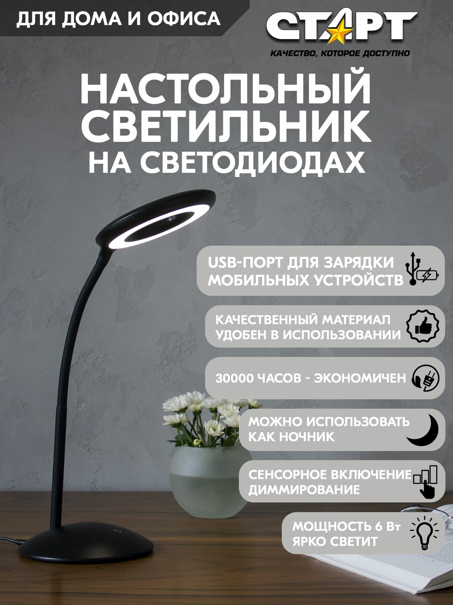 Светильник настольн. Старт СТ201 (светодиодный 6Вт сенсорное вкл, диммер, USB) черный 220В *1/8