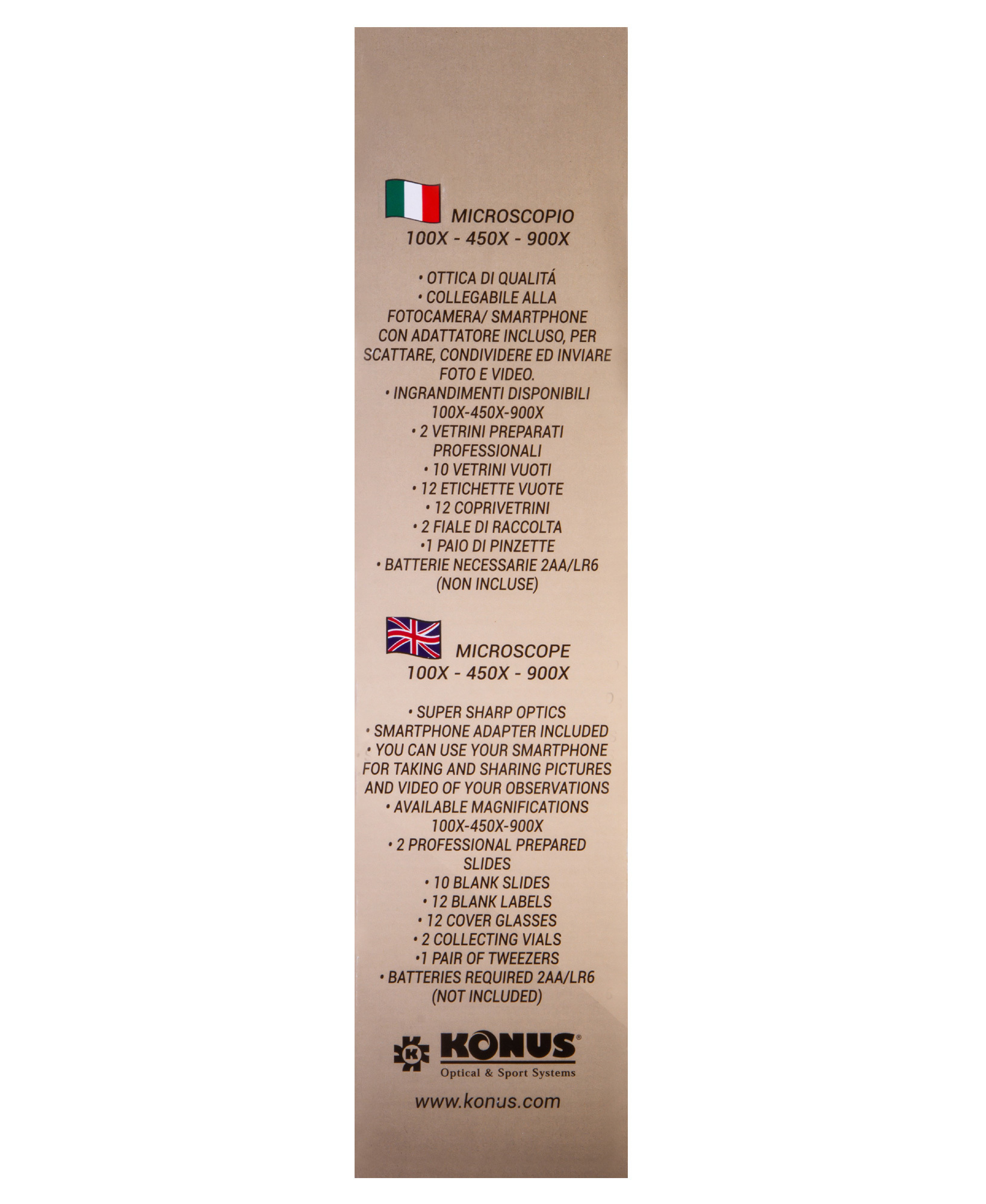 | Комплектация | микроскоп, готовые микропрепараты – 2 шт., предметные стекла – 10 шт., покровные стекла – 12 шт., стикеры для стекол – 12 шт., пустые флаконы – 2 шт., пинцет, адаптер для смартфона, инструкция по эксплуатации и гарантийный талон |