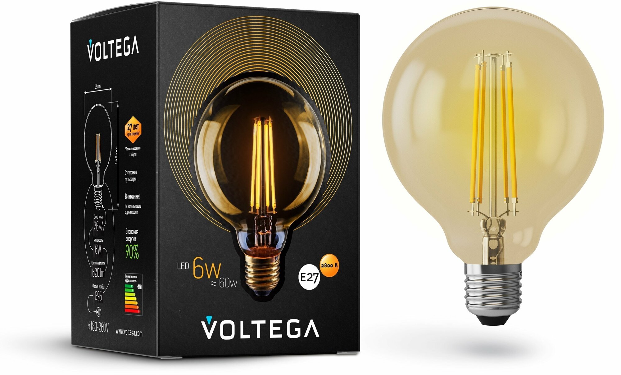 Лампа светодиодная Voltega 7084, E27, G95, 6 Вт, 2800 К