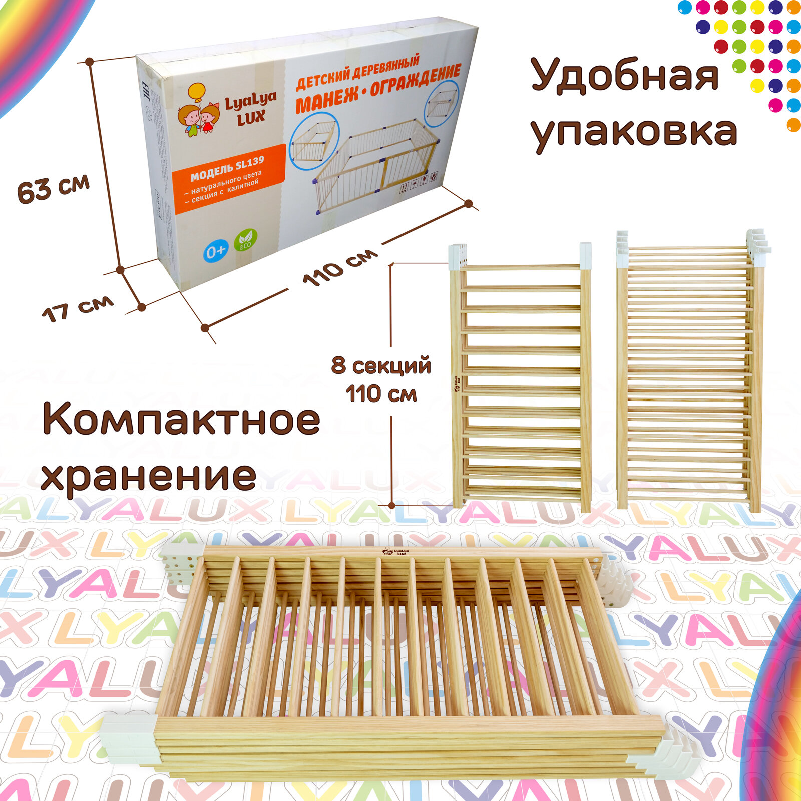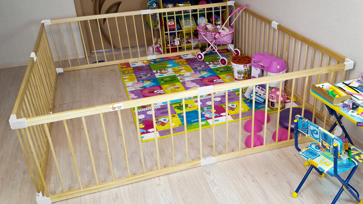 Большой деревянным манеж LYALYALUX SL133-W8, 8 секций 2,2х2,2м, белые соединители без калитки, цветные коврики-маты интересное: