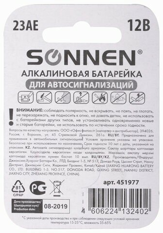 Батарейка SONNEN, 23АЕ, алкалин, 1 шт., в блистере, 12 В (для автосигнализаций), 451977