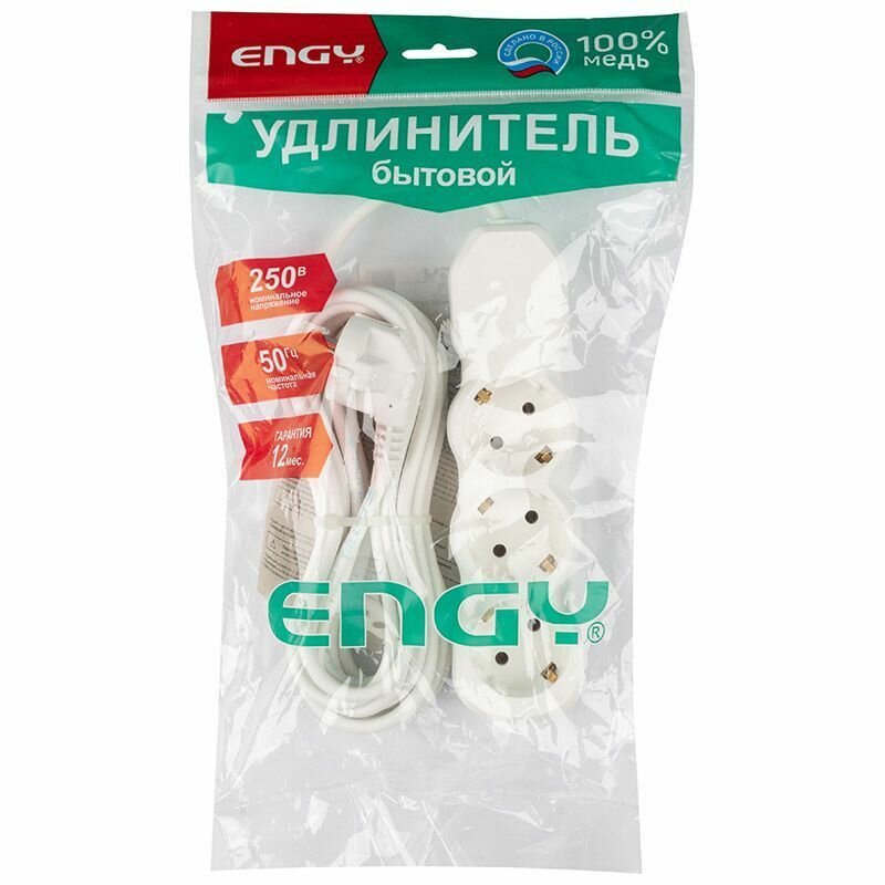 Купить Удлинитель Engy Гранд, ПВС 3 x 0,75 мм, с заземлением, 3 розетки, 5 м, белый