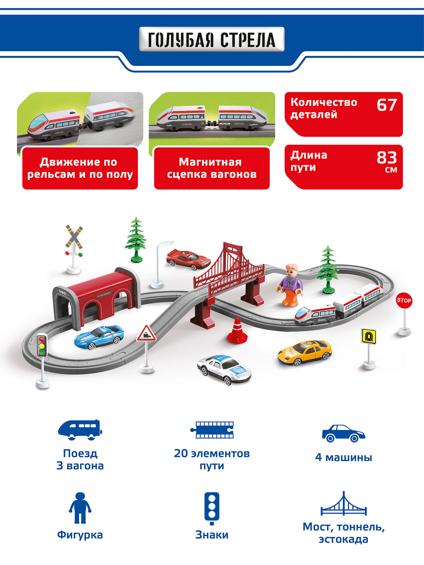 Железная дорога Голубая Стрела "Скоростной Поезд", с мостиком и тоннелем