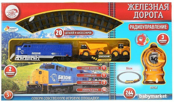 | Подробная комплектация | 1 грузовой локомотив, 1 грузовой вагон, 2 машины строительной техники, 16 элементов ж/д пути, пульт |