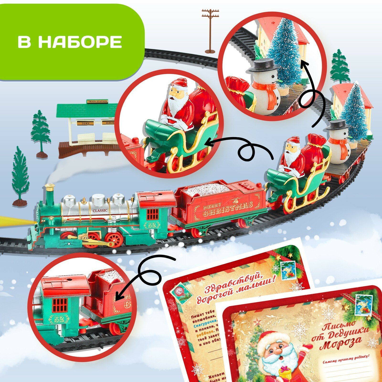 | Подробная комплектация | паровоз, грузовой вагон, сани с Дедом Морозом, опоры линии электропередач, деревья, остановочный комплекс, конверт с письмом от Деда Мороза |