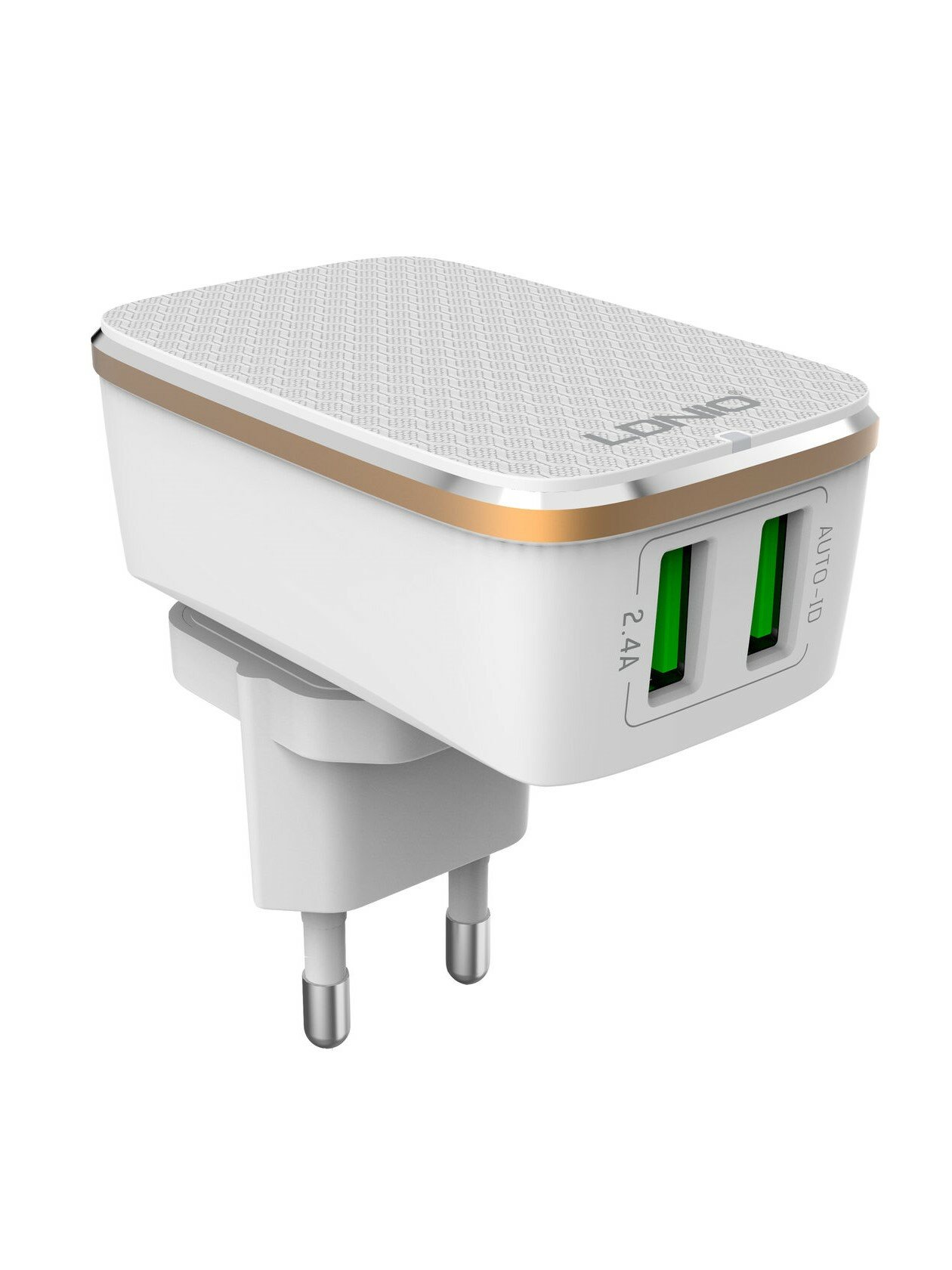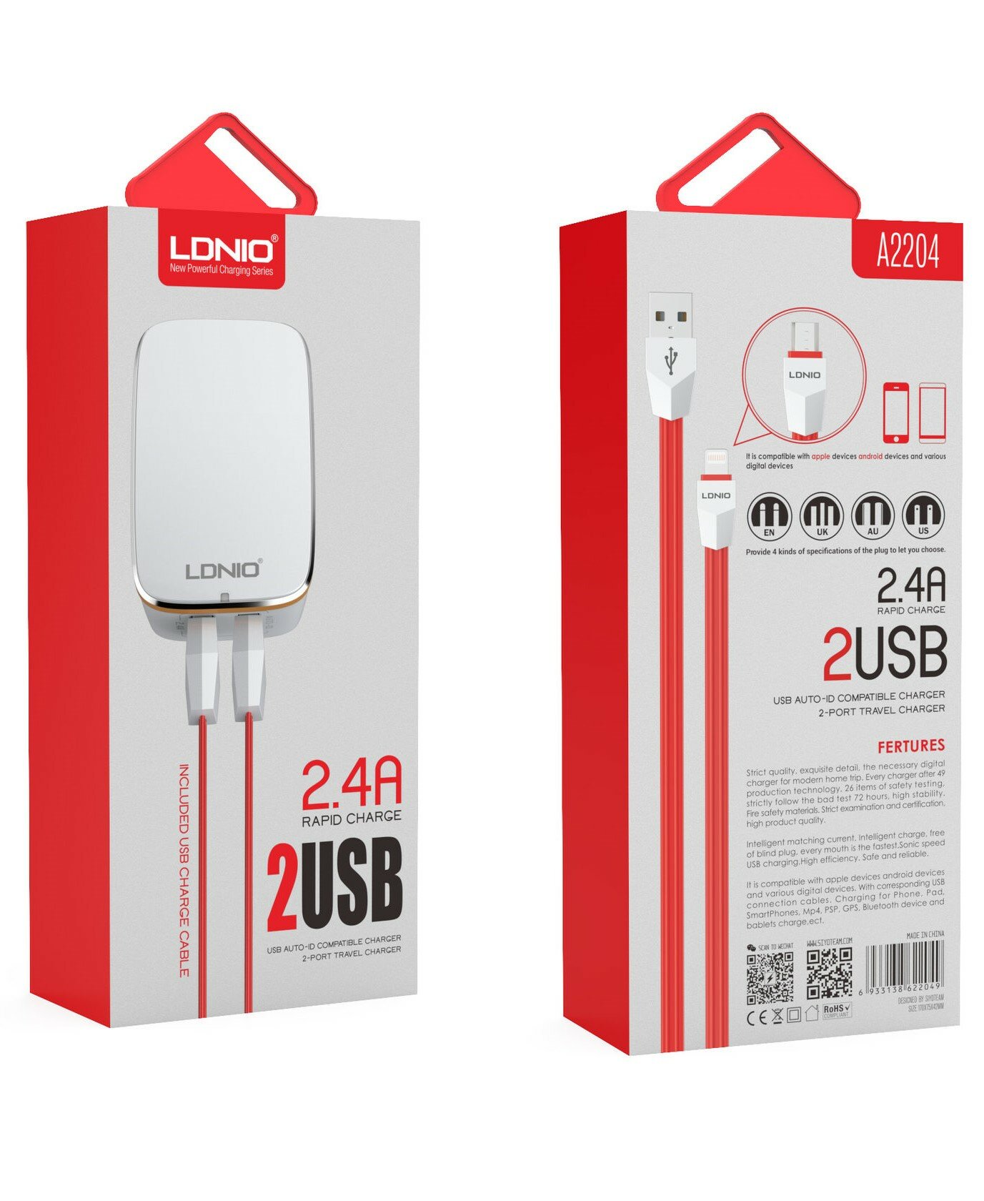 Купить Сетевое зарядное устройство LDNIO A2204+Кабель Lightning / 2 USB Auto-ID/ White/ Premium