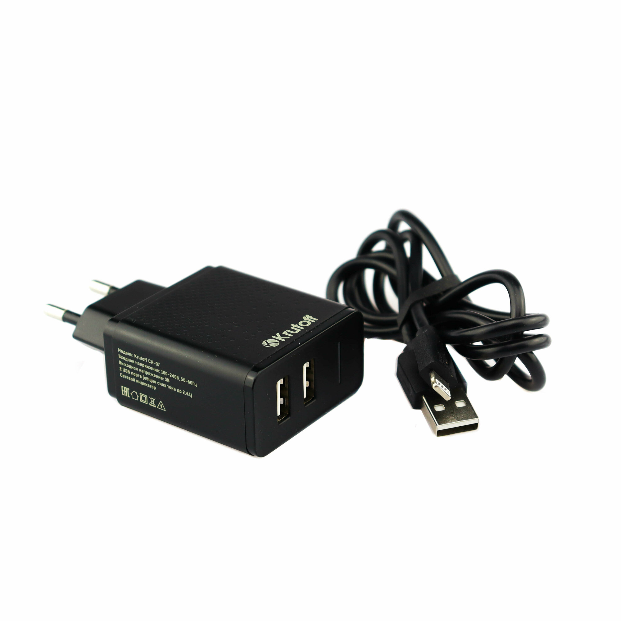 | Подробная комплектация | Модель: Krutoff CH-07L Black. Материал: матовый ABS+PC пластик.Огнеупорный корпус (соответствие стандарту UL94-V0). 2 USB порта, общая сила тока до 2.4А. При подключении двух устройств ампераж распределяется на два порта. Сетевой индикатор на корпусе, при подключении СЗУ к сети светится голубым цветом. В комплект входит кабель Krutoff Classic с разъемом Lightning |