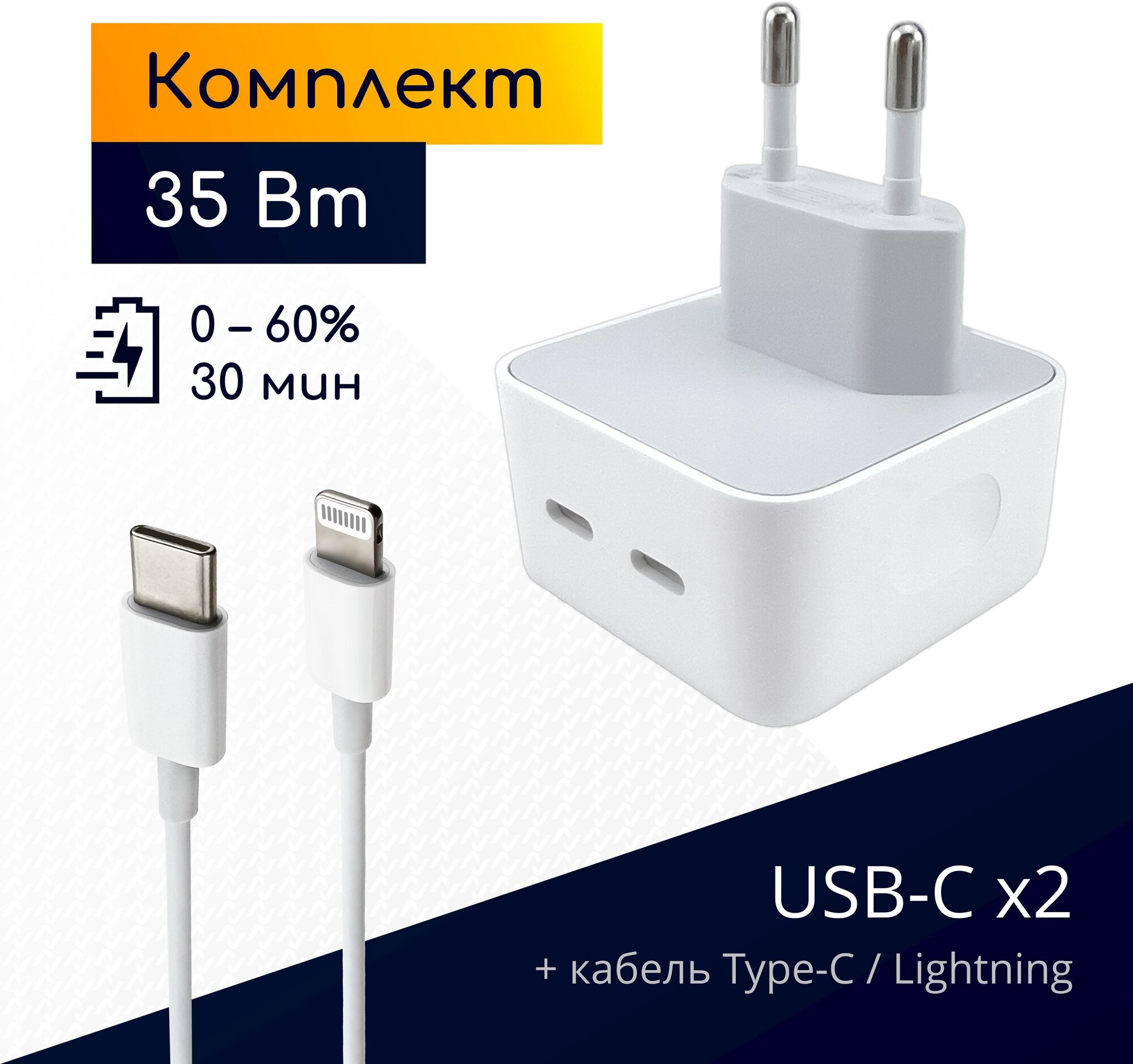 Комплект 2 в 1 быстрое сетевое зарядное устройство 35 Вт на 2 разъема USB-C + кабель с USB-C - Lightning (1 метр)