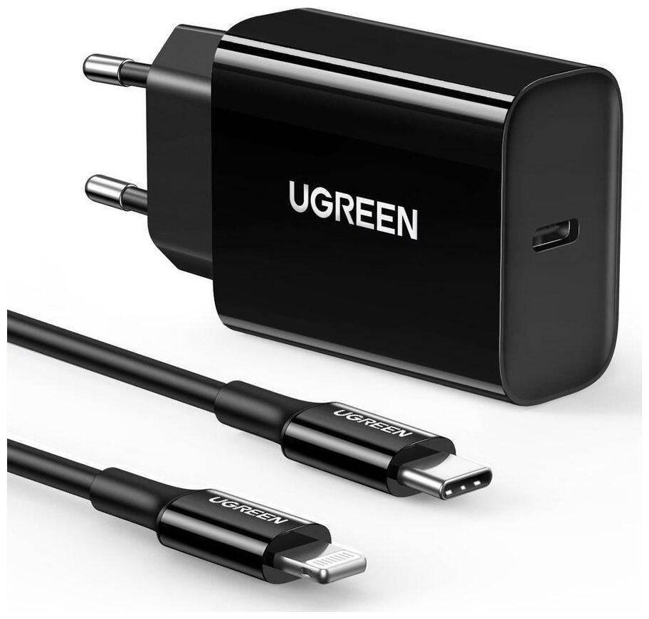 Набор адаптер и кабель USB-C - Lightning UGREEN CD137 (50799) PD Fast Charger 20W + USB-C to Lightning Cable EU. Длина 1 м. Цвет: черный