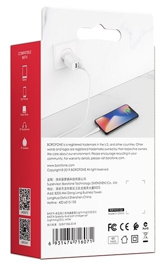 Ниже Вы можете прочитать отзывы на Сетевое зарядное устройство Borofone BA37A Speedy + кабель Lightning, 12 Вт, белый, ознакомится с подробными характеристиками, посмотреть интересные обзоры и фотографии на Сетевое зарядное устройство Borofone BA37A Speedy + кабель Lightning, 12 Вт, белый.