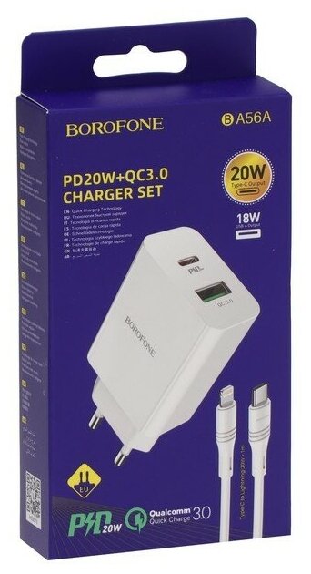Сетевое зарядное устройство BOROFONE BA56A Lavida 1xUSB QC3.0, PD 20W + кабель USB-C Lightning 8-pin, 1м (белый)