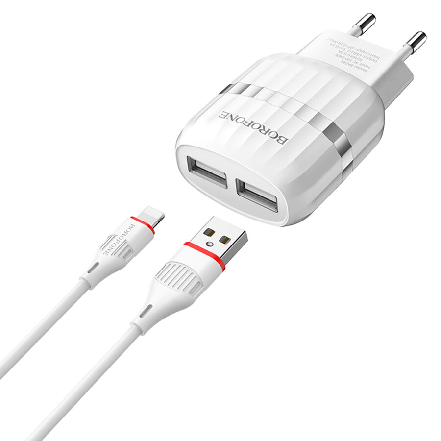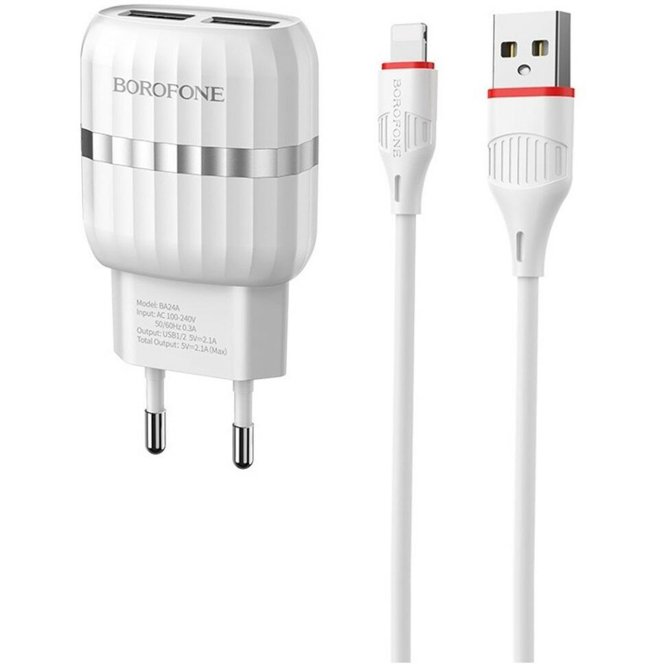 Сетевое зарядное устройство BOROFONE BA24A Vigour 2xUSB с Кабелем USB - Lightning, 2.4A, белый