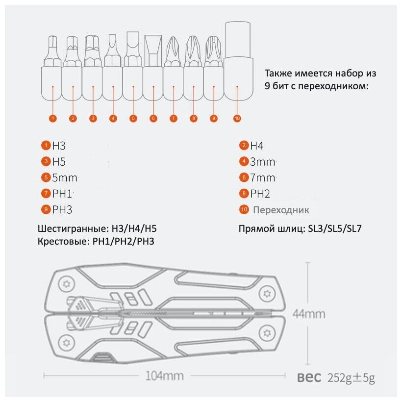 | Инструменты (функции) | нож / ножницы / отвертка / открывалка для бутылок / пассатижи / пила |
