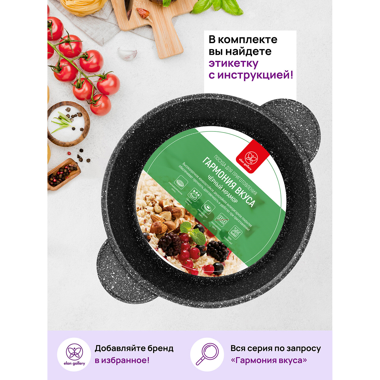 Кастрюля Elan Gallery гармония вкуса черный мрамор с крышкой 18 см, 2 л