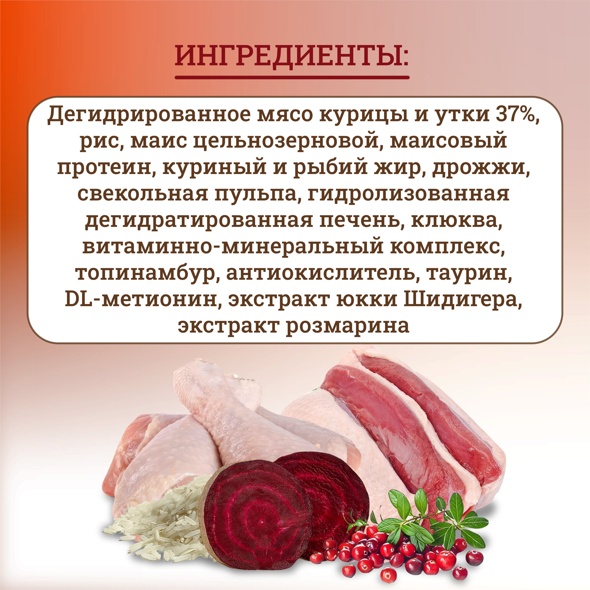 | Состав | дегидрированное мясо 37% (утка, курица), кукуруза, глютен кукурузный, рис, жир куриный, гидролизованная и дегидратированная печень 3%, свекольная пульпа, дрожжи (источник маннанолигосахаридов), витаминно-минеральный комплекс, таурин, топинамбур (источник инулина – фрукто-олигосахаридов), клюква, DL-Метионин, антиокислитель, экстракт юкки Шидигера, экстракт розмарина |