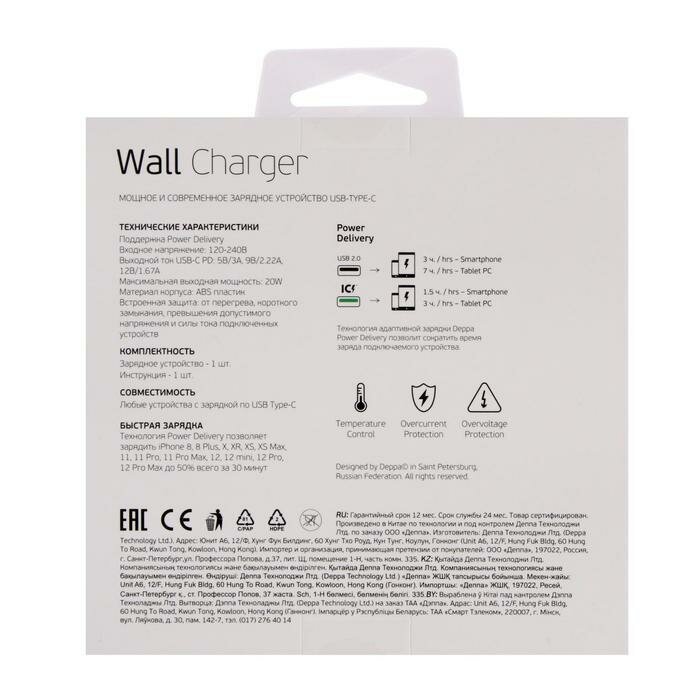 Сетевое зарядное устройство с USB Type-C Power Delivery 20 Вт, Deppa белая