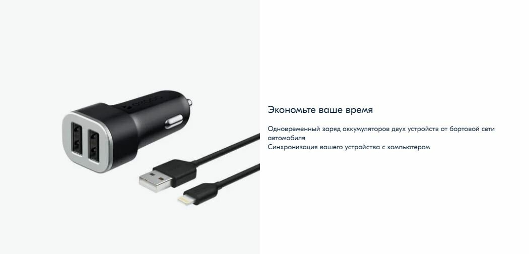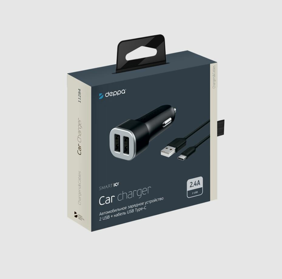 Автомобильное зарядное устройство Deppa 2 USB 2.4А с дата-кабелем USB Type-C 11284