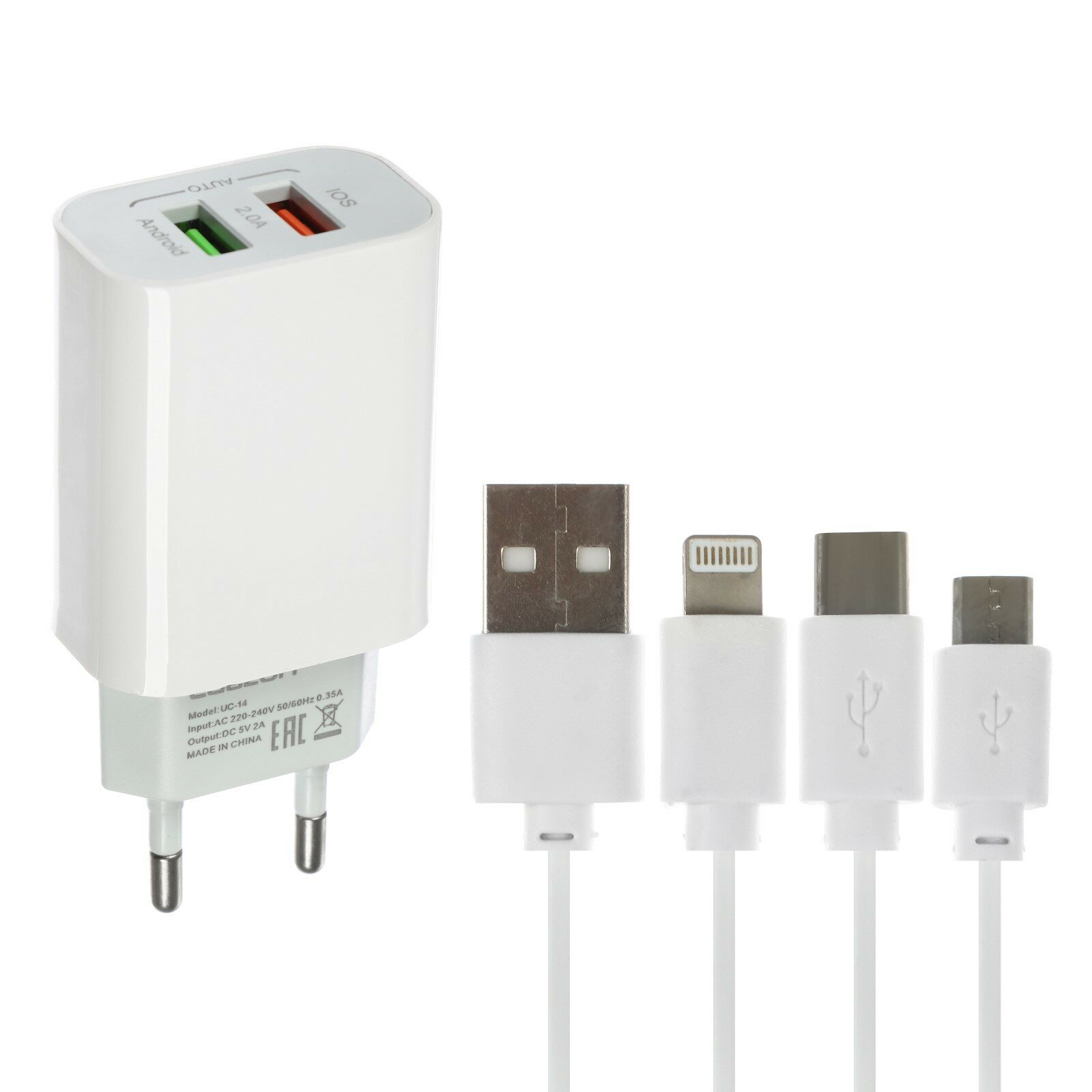 Сетевые зарядные устройства Luazon Home Комплект для зарядки 3 в 1 LuazON UC-14, СЗУ 2хUSB, 2A, microUSB/Type-C/Lightning, белый