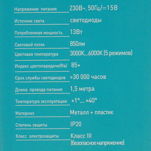 | Дополнительная информация | пять режимов цветовой температуры от 3000К до 6000К |