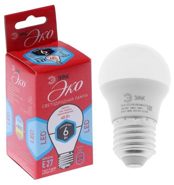 ЭРА Лампа светодиодная ЭРА E27 6W 4000K матовая ECO LED P45-6W-840-E27 Б0020630