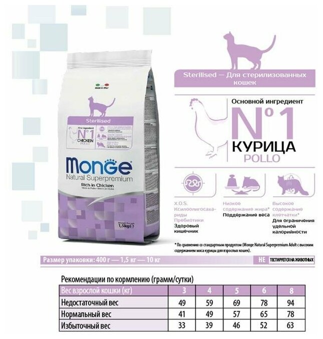 Ниже Вы можете прочитать отзывы на Monge Cat Sterilised корм для стерилизованных кошек всех пород, курица 10 кг, ознакомится с подробными характеристиками, посмотреть интересные обзоры и фотографии на Monge Cat Sterilised корм для стерилизованных кошек всех пород, курица 10 кг.
