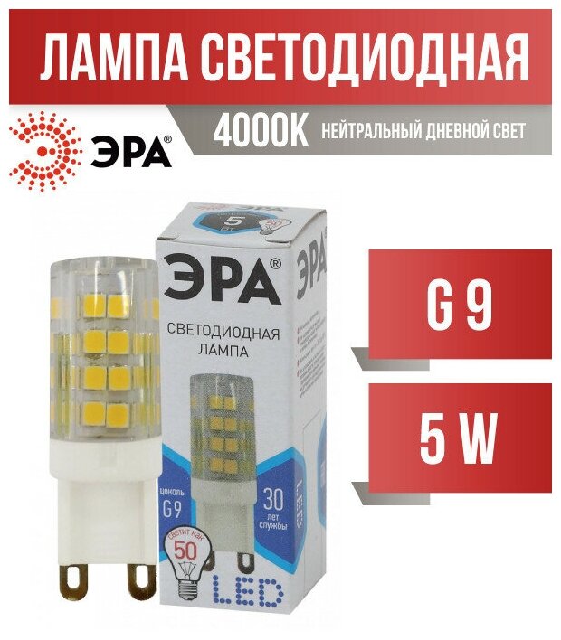 ЭРА стандарт G9 220V 5W(400lm) 4000K 4K 50x16 JCD-5w-220V-corn, ceramics-840-G9 силикон, керамика 65 (арт. 621258) интересное: