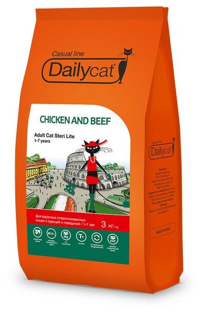 Купить Dailycat Casual Line Adult Steri Lite для взрослых стерилизованных кошек с курицей и говядиной 3 кг