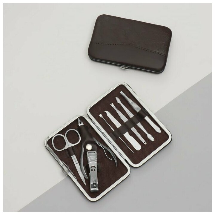 Набор маникюрный, 8 предметов, в футляре, цвет коричневый