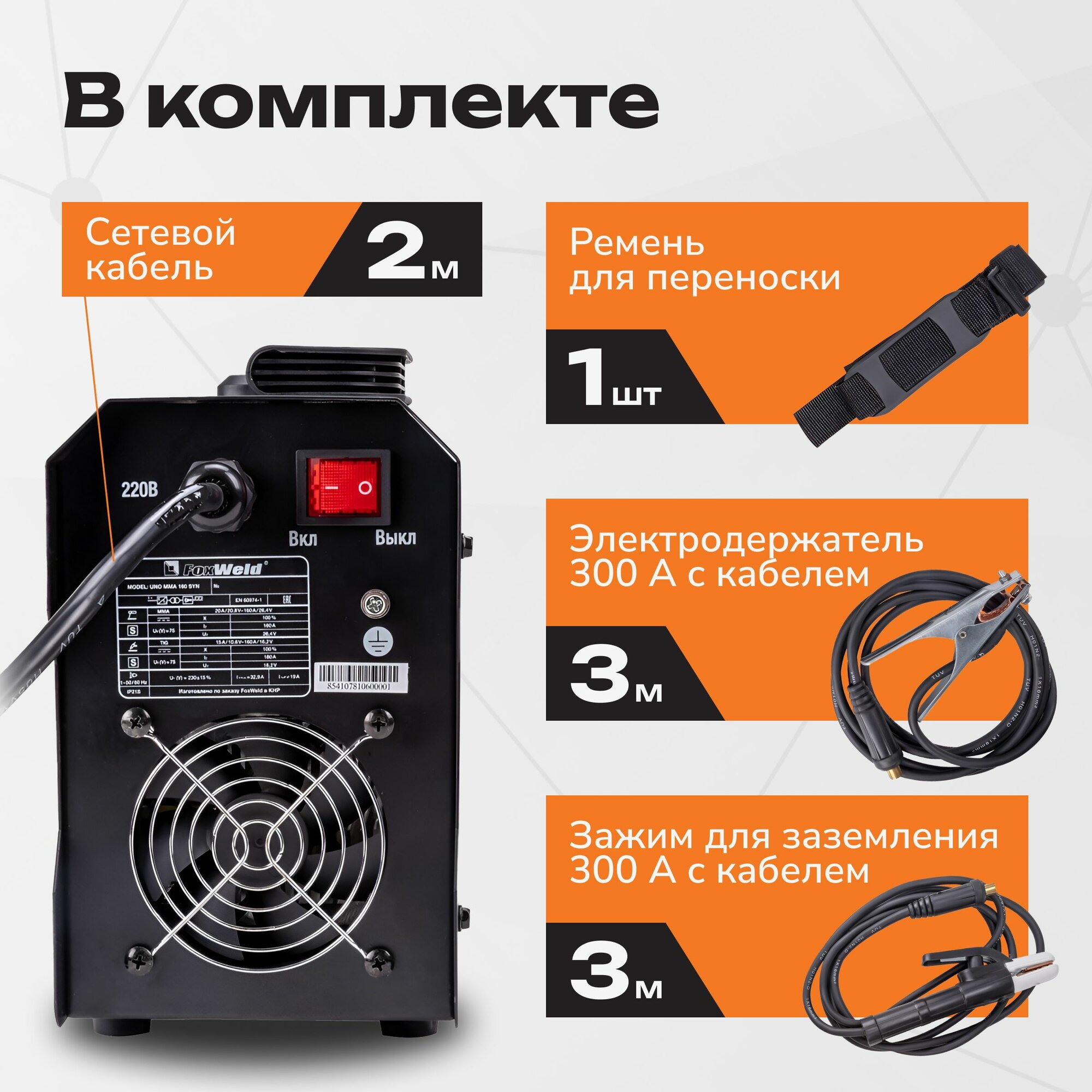| Комплектация | - Электрододержатель с кабелем КГ-1х16, 300 А, 3 м.; - Клемма заземления с кабелем КГ-1х16, 300 А, 3 м; - Сетевой кабель 3х2.5мм2, 2 м; - Ремень; - Инструкция; - Гарантийный талон. |