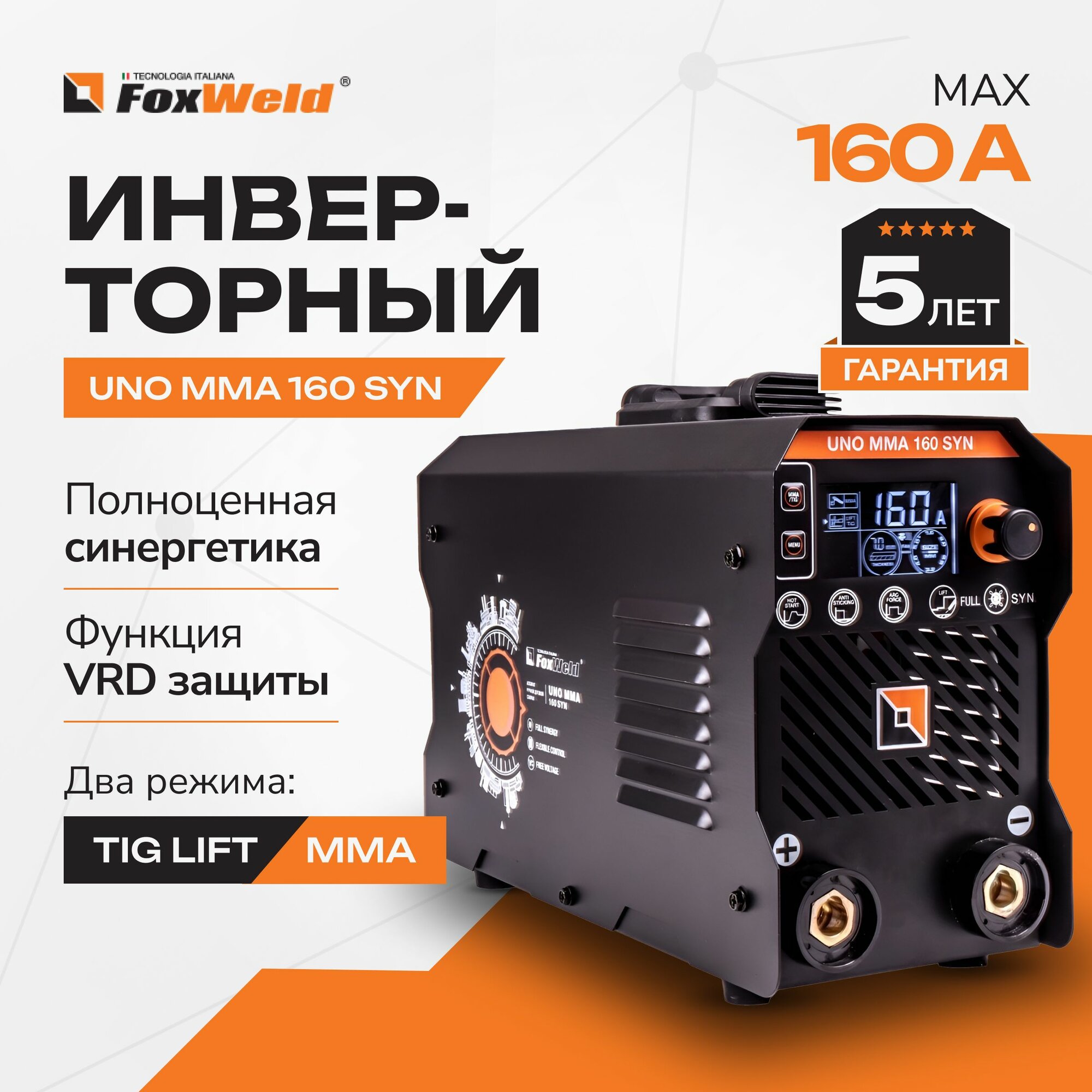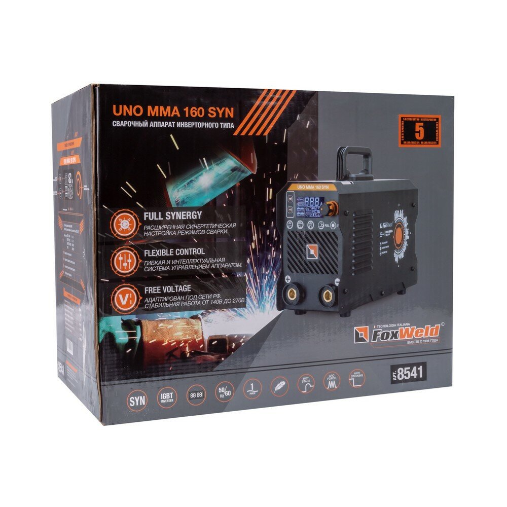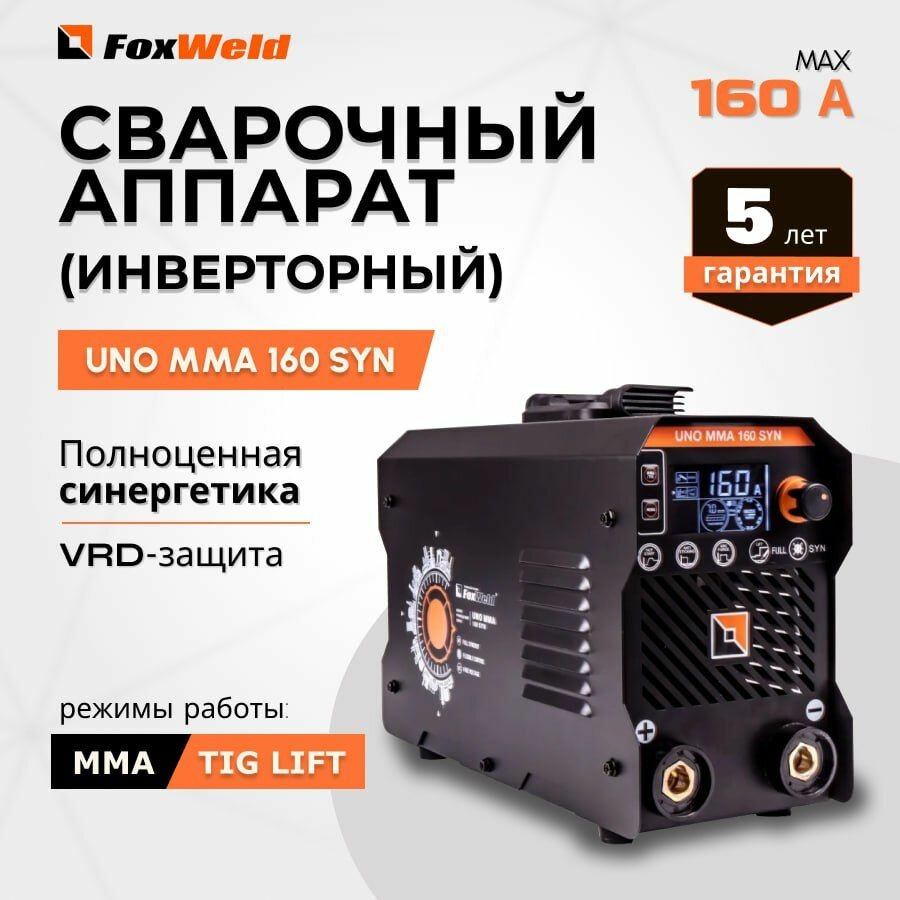 Foxweld Сварочный аппарат UNO MMA 160 SYN ручная дуговая сварка, ПВ 100%, VRD, Горячий старт, Форсаж дуги, Антизалипание электрода, LIFT TIG