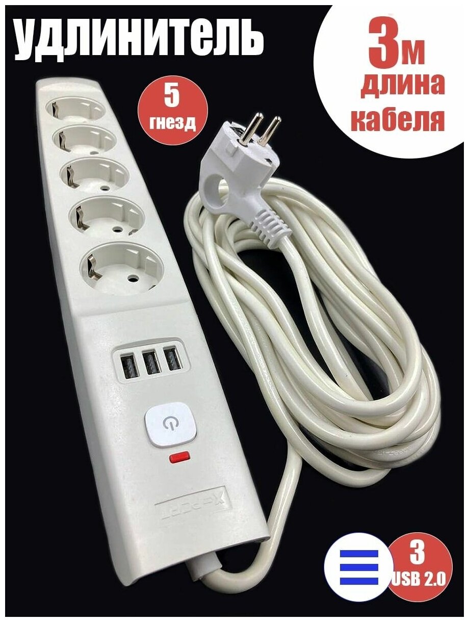 Удлинитель 5розеток 3usb, 3 метра кабеля