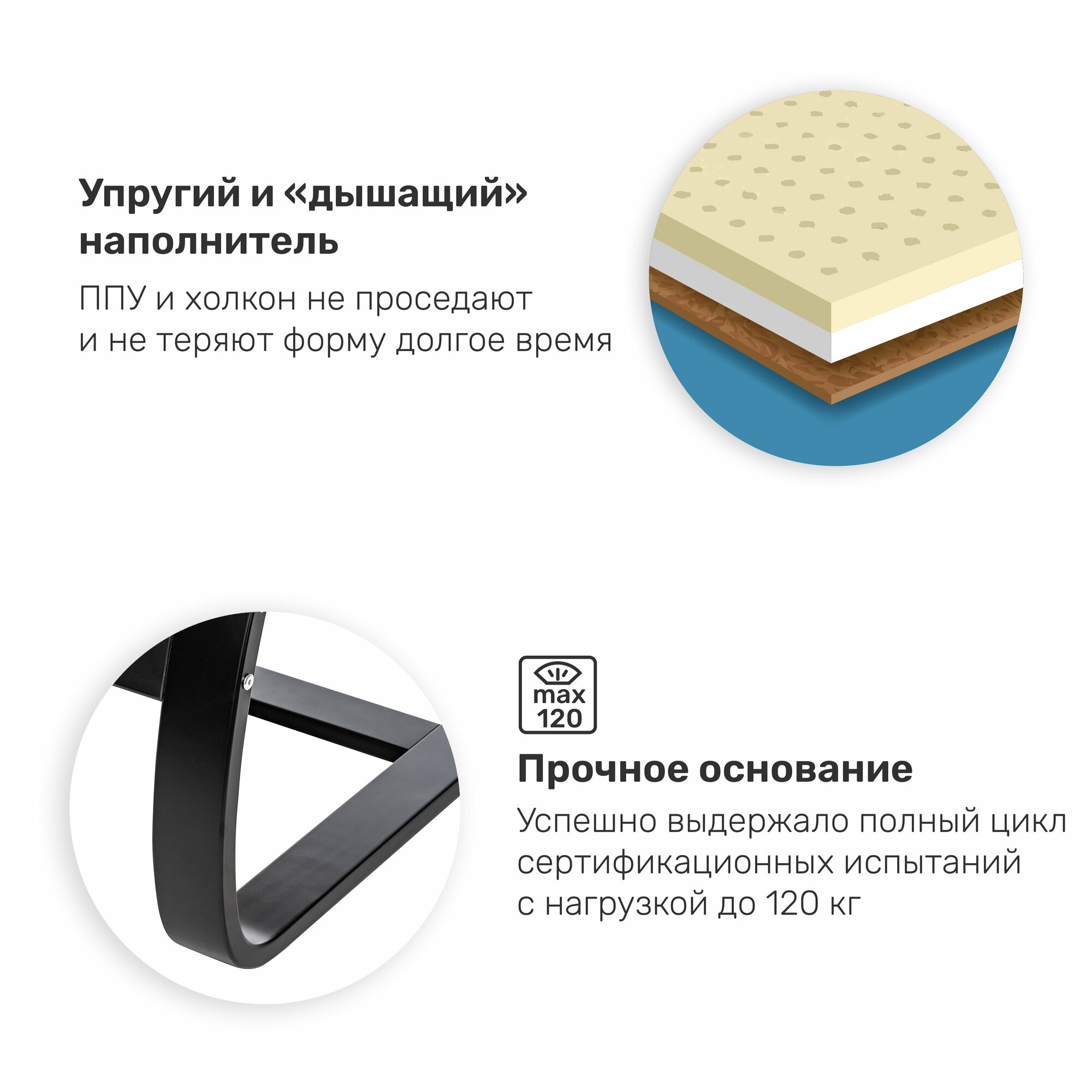 | Дополнительная информация | материал наполнителя: ППУ, холкон; высота от пола до сиденья — 45 см; глубина сиденья — 50 см; ширина сиденья — 54.5 см; высота спинки — 70 см; угол наклона спинки — 110°; ширина подлокотника — 7 см; толщина мягкого элемента — 11 см |